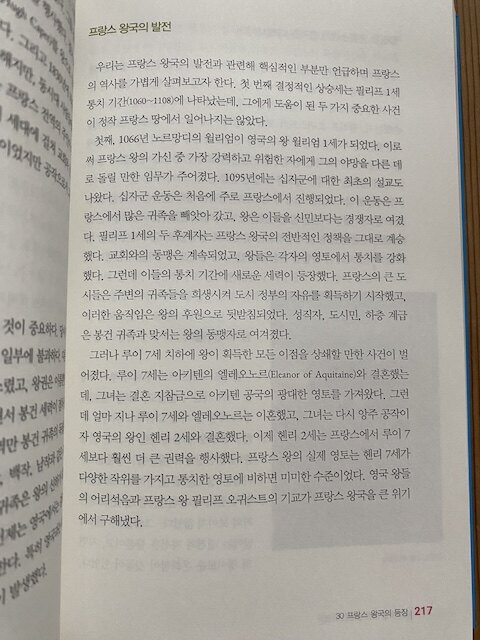 흔히 중세를 암흑의 시대라고 부릅니다. 정치, 경제, 사회, 문화, 예술, 군사, 법률 등 거의 모든 분야에서 발전을 이루었던 로마는 게르만족에 의해 멸망하였는데 여러 게르만족들은 로마의 유산을 파괴하였으며 민족마다 자신들의 나라를 세웠습니다. 로마의 역사를 다룬 책에 비하면 이후에 세워진 나라들을 다룬 책은 많지 않습니다. 그래서 어떤 일이 있었는지 잘 몰랐는데 서로 전쟁을 벌이다가 힘에 의해 질서가 재편되면서 오늘날 독일, 프랑스, 이탈리아의 원형이 나타났습니다. 교회의 권한이 강해지면서 황제가 교황에게 굴복한 카노사의 굴욕이나 부패한 가톨릭에 대항하면서 등장한 종교 개혁도 유럽 역사의 큰 갈림길이었네요.