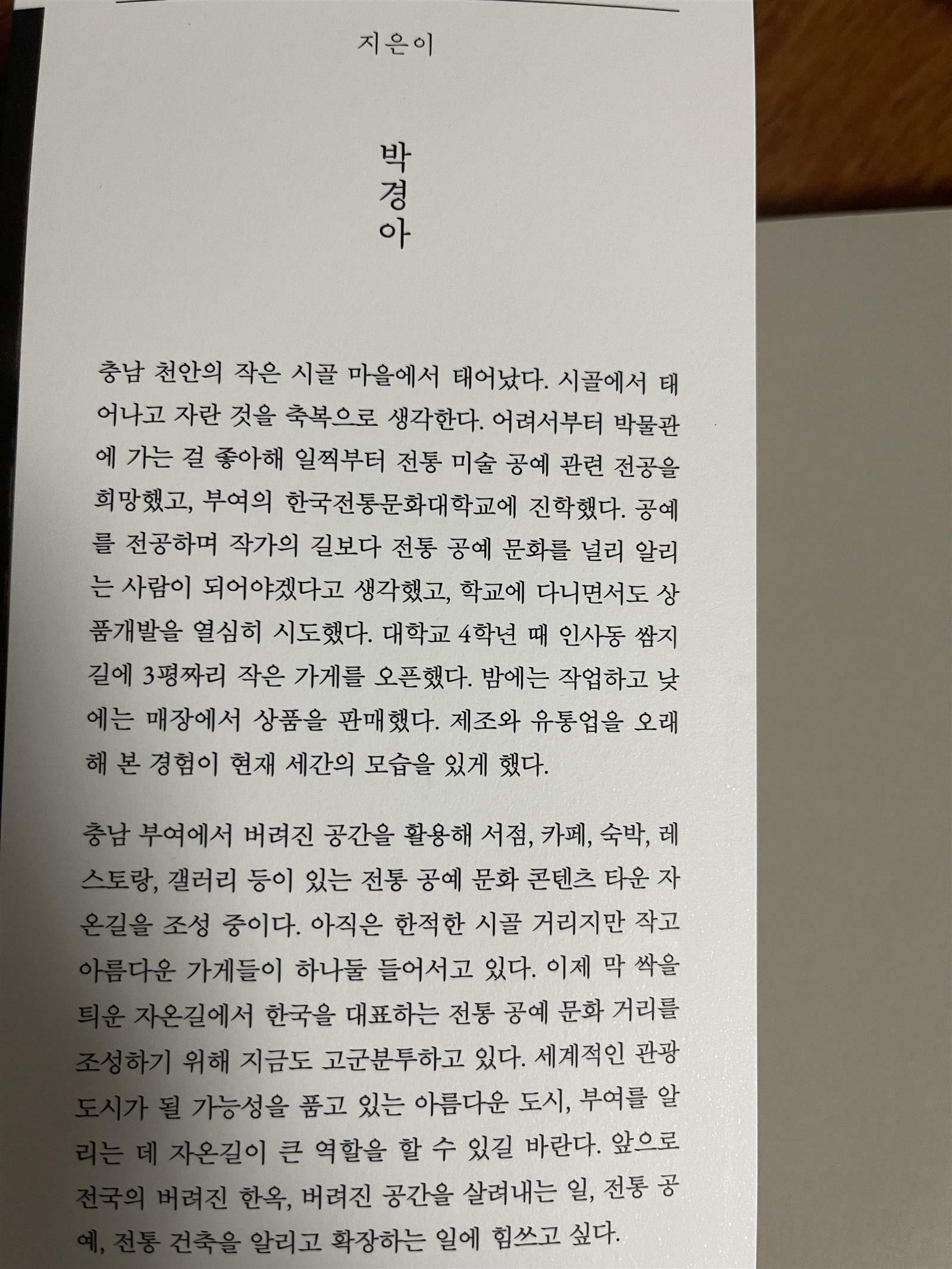처음에는 단순히 공예를 중심으로 폐허가 되어 간  부여의 작은 어느마을인 규암마을의 재생프로젝트와 관련 된 내용으로만 읽었다.하지만 읽으면서 저자가 지키고자 하는 과거의 흔적과 전통에 대한 공감이 생겼으며 민족의 한사람으로서 열렬히 지지하게 되었다. 가볍게 읽을 수 있지만 진정 가볍지 않은 책인 것 같다.