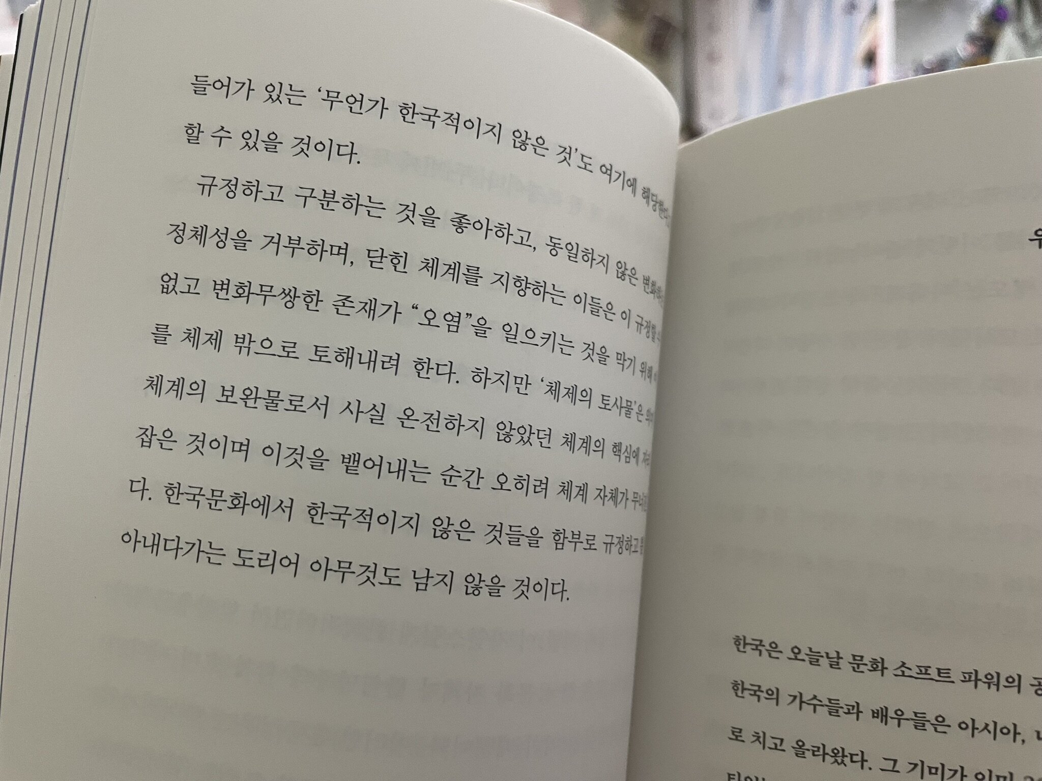 이 책을 통해 일상에서 익숙하게 받아들이고 있는 문화적 현상들의 배경과 이면을 들여다 보는 것이 재밌었다. 무엇이 옳고 그르기를 가르기보다는 이것과 저것이 만나 만들어 내는 새로운 가치와 힘에 사람들은 열광하고 있다. 이러한 힘은 새로운 미래로 나아가는 원동력이 되고 있다. 특히, 대한민국은 이런 혼종의 힘을 잘 키워내고 이용하고 있다고 생각한다. 앞으로는 어떤 새로운 혼종들이 생겨날까 궁금해진다.