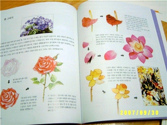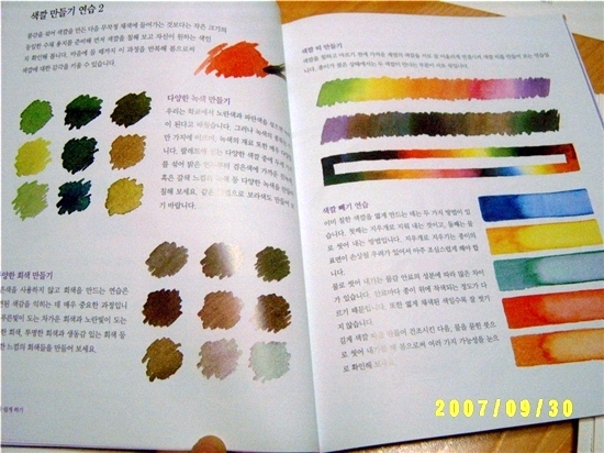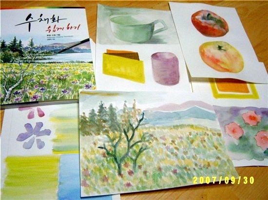 김충원님의 수채화 쉽게하기 투명수채기법편이다. 미술시간을 젤로 좋아했고 미술쪽 이랑 연관된 직업을 갖기도 했다... 하지만 미술은 언제까지나 나에게 있어 동경의 대상이다.... 책속에는 수채화의 기초적인 그리기 방법이 소개되어 지고 있다. 물감다루기에서 색칠하기 까지..여러가지의 기법들과 다양한 소재들을 여러가지 방법으로 그릴수 있는 방법들이 소개가 되어 초보자도 쉽게 아니 조금은 자신을 가질수 있었다.. 책속에 소개되어진 수채화를 잘그리는 10가지비법을 소개하자면.. 1.수채화에 관한 어두운 기억은 모수 잊는다. 2.잘그린 그림에 대한 고정관념을 없앤다. 3.먼저 수채화의 특성을 파악한다. 4.흉내 내는것부터 시작한다. 5.간단하고 쉬운 그림부터 선택한다. 6.스케치로 기초를 다진다. 7.즐기면서 그린다. 8.누군가와 함께 그린다. 9.실패를 두려워 하지 않는다. 10.서두르지 않는다. 책의 뒷쪽에 마련된 연습장을 가지고 페이지에 소개되어진 채색기법에 따라 서툰솜씨지만 흉내를 내봤다. 정말 많이 부족하지만 그래도 뭔가 했다는 데 자신감을 느낄수 있었다. 미술을 좋아하는 아이와 함께 두고 두고 공부해 나가기 참 좋은 교재라 생각이 든다....^^