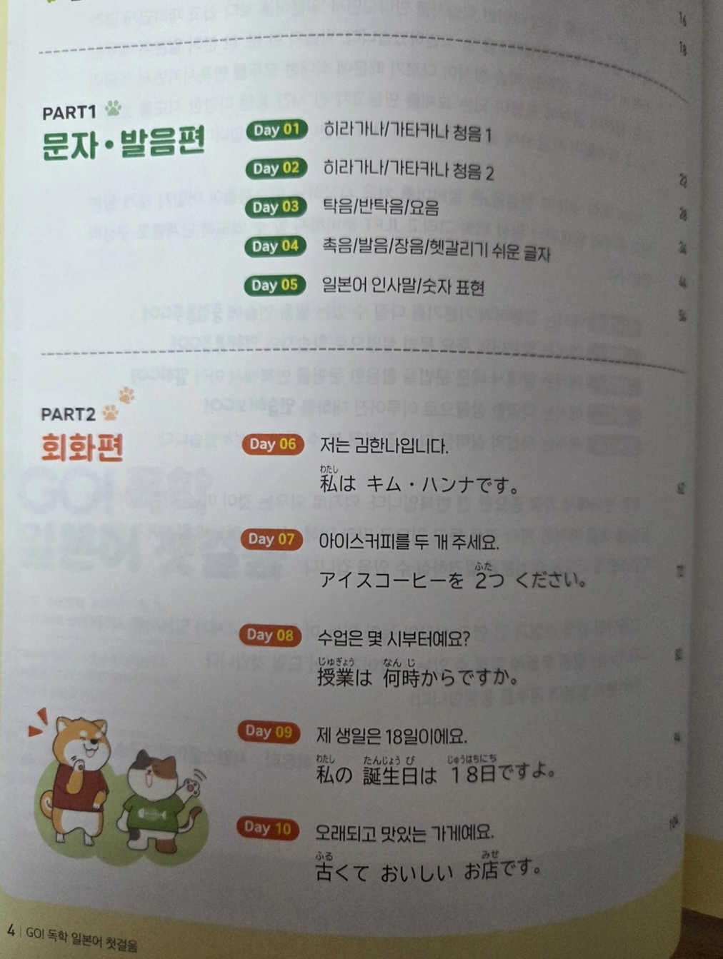그렇다고해서 단순히 예쁘고 귀엽기만 한 책은 아니다. 책의 제목에 걸맞게 히라가나, 가타가나 기본적인 문자,발음 뿐만이 아니라 기본 회화까지 단계별로 차근차근 나아갈 수 있게 도와주는 책이다. 또, 회화편은 실제 일본에서 활용할 수 있는 실용적인 회화 위주로 구성되어 있어 좋았다. 또 혼자 공부하는 사람들에게 필수인 원어민 발음 MP3을 속도별 음원을 제공해주어 자신 수준에 맞는 음원을 선택하여 듣고 연습할 수 있다.