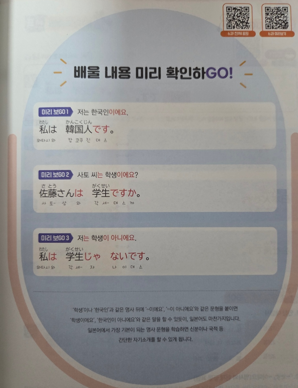 책은 본서와 워크북 2개로 나눠져 있다. 본서는 우선 각 과에서 배울 핵심 내용들을 한눈에 파악하기 쉽게 정리해놓은 페이지가 있다. 공부하기 전에 이 핵심내용을 보며 이번에는 어떤 내용이 중점적인 내용인지 파악하기 쉽다. 또 각 과들은 반드시 알아야 할 문형들을 자세한 설명과 예문으로 이해하기 쉽게 정리해두었고, 앞에서 배운 문형들을 활용해 일본어 말하기 연습까지 가능하도록 구성되어있다.