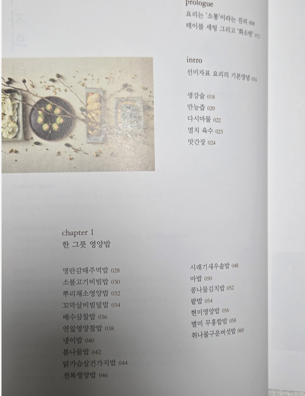 생강술, 만능즙 ,다시다물, 멸치 육수, 맛간장과 같은 요리의 기본 양념부터 한 그릇 영양밥, 입맛을 돋구는 반찬, 국과 찌개, 모던 김치, 분식과 간식, 명절 식탁, 퓨전 초대 요리와 일품요리까지 정말 다양한 요리 레시피들로 구성되어있다. 막상 레시피 책이라고 펼쳐보면 따라 할만한 요리가 몇가지 안되는 책들이 많은데, 이 책은 정말 이 한 권으로 여러가지 요리를 시도해볼 수 있겠다라는 생각이 들었다. 또, 계절과 상황에 따라 선택할 수 있는 레시피들도 많아 유용할 것 같았다.