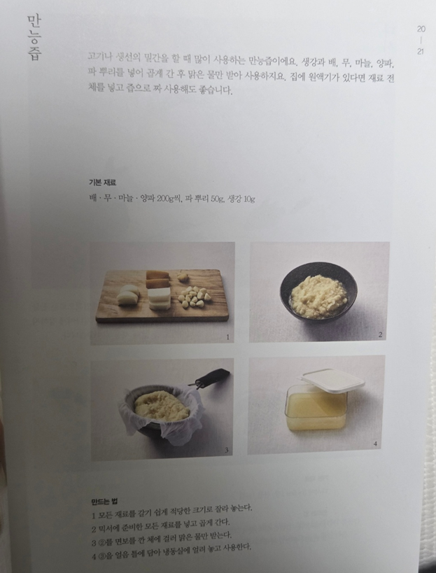 특히 기본 양념 중 '만능즙' 부분이 인상 깊었다. 집에서 고기나 생선류를 먹을 때가 많은데 그때마다 잡내와 밑간을 잡기 위해 이런 저런 레시피들을 사용해보았었다. <선미자의 맛>에서 제공하는 만능즙은 한번 만들어놓고 얼음 틀에 담아 냉동실에 얼려 놓고 사용하기 좋을 것 같아서 언제 한번 시간내서 대용량 만능즙을 만들어봐야겠다는 생각이 들었다.