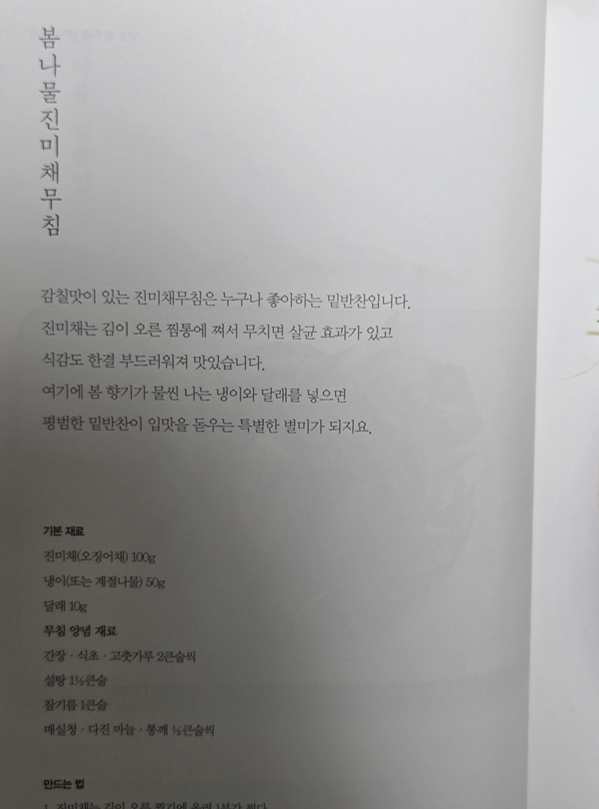 양념 제외한 다른 레시피 중에서는 '봄나물 진미채무침' 이 인상깊었다. 곧 다가올 봄에 냉이와 달래를 넣어 진미채무침을 해보고 싶다. 소개글처럼 진미채자체는 평범할지 몰라도 봄 향기가 나는 냉이와 달래를 넣으면 특별한 별미가 될 것 같다. 이 책의 장점 중 하나가 바로 이런 평범한 반찬들을 특별하게 만드는 몇가지 요소들을 알려줘 어렵지는 않지만 특별한 요리를 만들어볼 수 있다는 것이 가장 큰 장점인 것 같다.