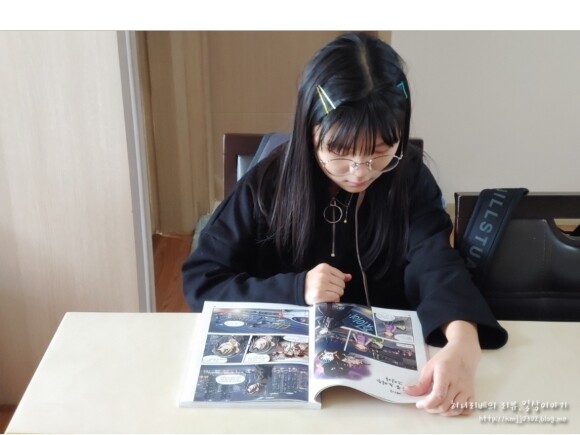 잠잘 준비 완료하고 책장을 넘겨보는 딸램이에요.