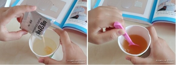 물이 담긴 종이컵에 가루 배지를 모두 넣고