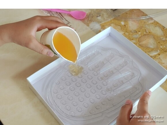 숟가락으로 용액을 저으며 열기를 식힌 후,