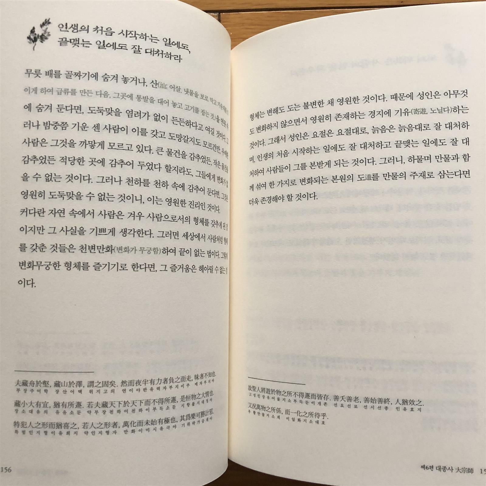 치열한 삶을 살다가 나이가 들어 은퇴할 무렵이면 누구나 자의 삶을 한 번쯤은 되돌아보고 싶은 마음이 들것이라 생각한다. 물론 꼭 은퇴할 무렵이 아니더라도 인생을 살아가면서 종종 자신의 삶을 성찰하고 상황과 연령에 맞게 삶을 조정해 갈 수 있다면 참으로 바람직한 인생을 살 수 있을 것이라 생각한다. 장자는 여러 문장을 통해 '욕심을 버려라' 그럼 간절히 바라는 것에 자연스레 다가갈 것이며 내가 이루지 못한 것에 대한 마음이 크지 않아 상처가 되지 않는 깨달음을 주고, 돈이나 지위, 명예의 욕심에 얽매이지 말고 자유롭게 살아서 인격적으로 완성된 세상을 사는 도리를 터득함으로써 명예나 과욕 모두가 외적인 것이므로 오히려 담백한 마음을 갖고 세상을 바라보라고 했다.