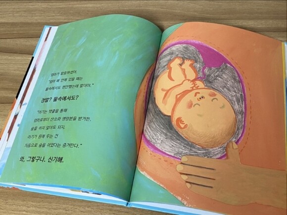 탯줄로 산소와 영양분을 받기 때문이라고 얘기해주니