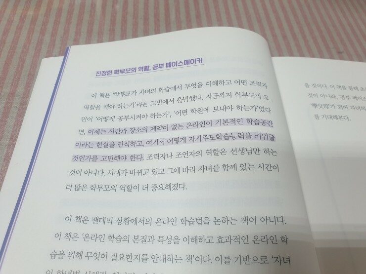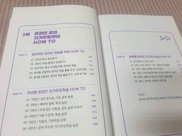 앞부분 파트에는 온라인 학습에 대한 내용, 시대의 변화, 자기주도 학습에 대한 내용들이 나와요.