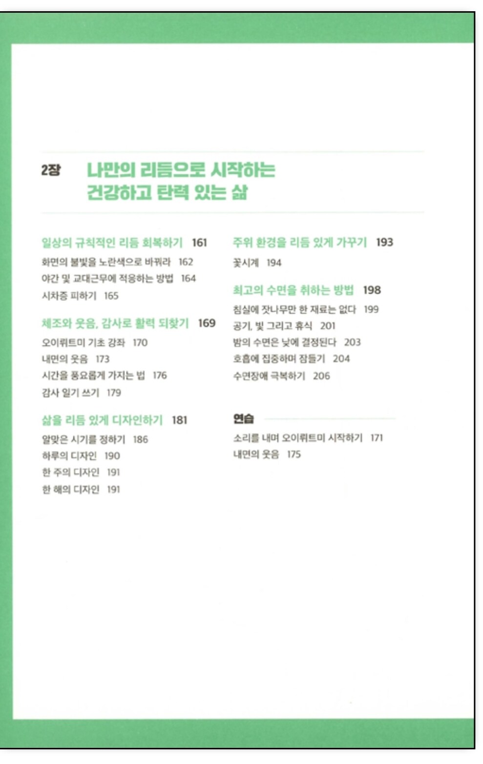 수면뿐 아니라 음악적 리듬, 식습관에 따른 체계적인 리듬의 결합이 안 아프게 백년을 견고히 살아갈 수 있음을 이 책을 통해 확인할 수 있고, 각 국가, 지역, 문화적 특성에 따른 리듬 타기의 비법을 우리는 터득할 수 있다.