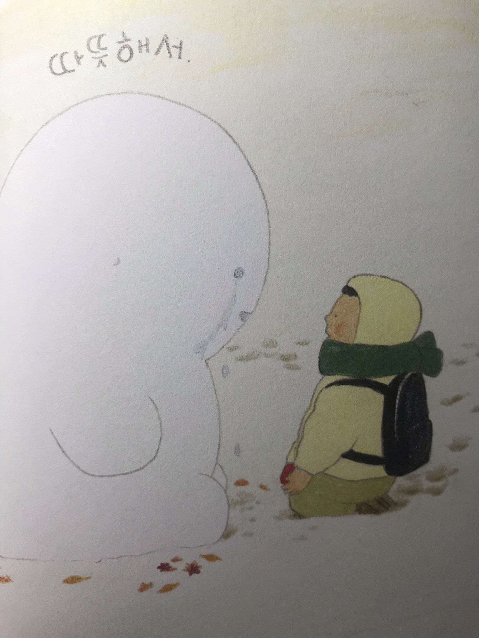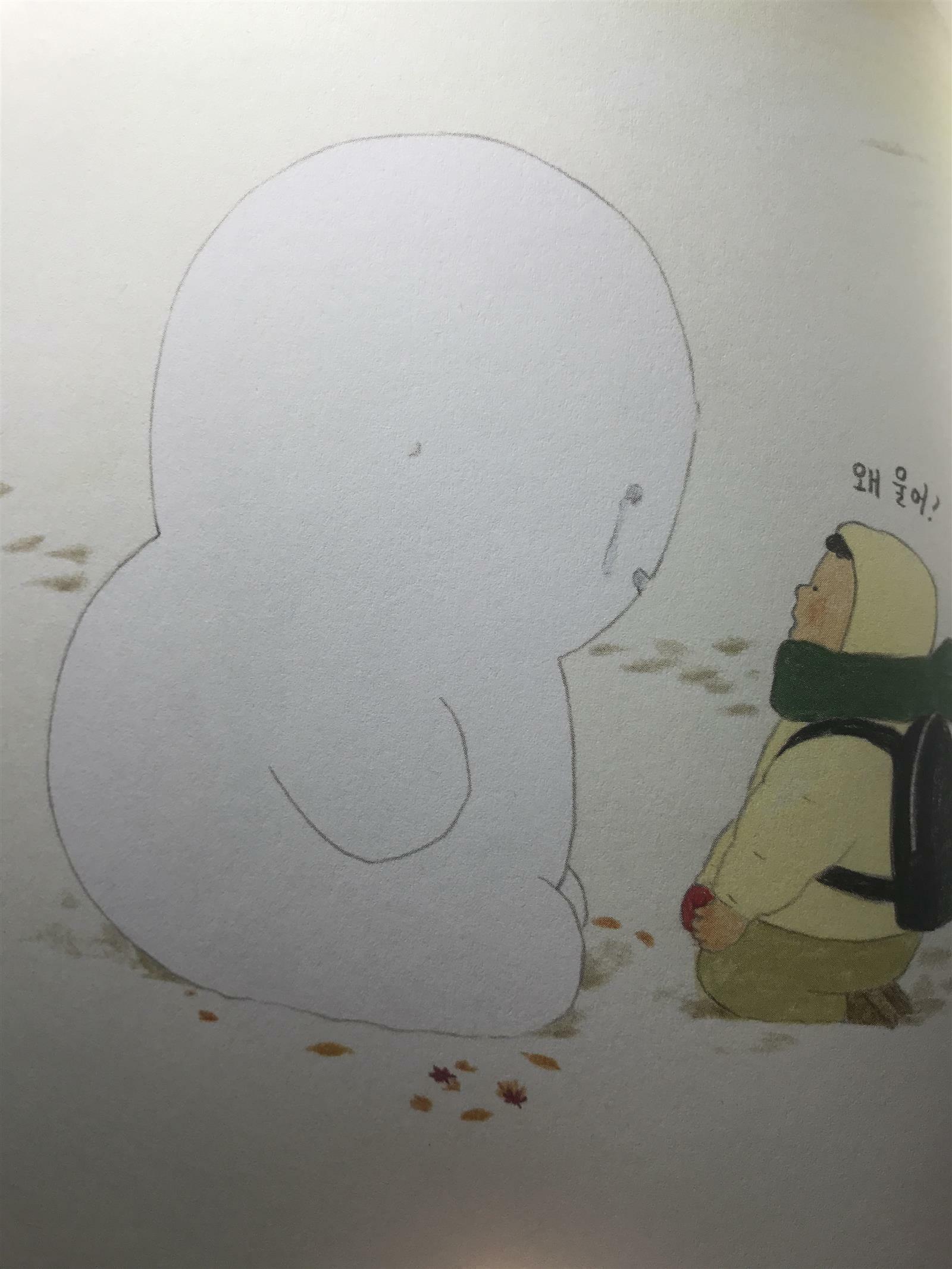 눈아이가 뽀득거리는 눈 덩어리에서 아이와 소통하는 눈아이로 완성된 장소는 나무 아래입니다. 겨울 끝자락의 햇살 아래 녹아 더러워지고 작아진 눈아이와, 사람 아이가 돌아온 장소 또한 그 나무 아래였습니다. 숨바꼭질 술래가 되어 사람 아이가 숫자를 다 세고 뒤돌았을 때, 눈아이는 어디로 갔는지 찾을 길이 없었지요. 그림책은 빠르게 계절의 전환을 보여줍니다. 사람 아이는 여전히 숨바꼭질 술래 처지입니다. 봄여름 가을에도 종종 허공을 향해 "못 찾겠다!"라며 외쳐 봅니다. 아이가 게임을 끝내지 않았기에, 1년 후 다시금 눈이 내렸을 때까지 두 아이의 인연은 이어집니다. 눈이 내리니, 누군가는 눈사람을 만들기 마련. 처음 뽀득거리는 눈사람 모양 눈덩이를 발견했던 등굣길의 언덕 위 그 자리에서 사람 아이는 누군가가 빚어놓은 눈아이와 1년 만에 재회합니다.