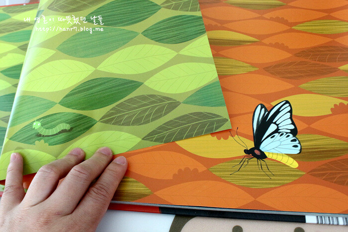 책장을 넘기자 애벌레 그림과 나비 그림이 연이어 나오는데요