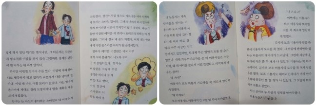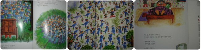 엄마는 화가 나서 가방으로 마귀 미용사들을 때리려고 하고, 마귀들은 멀리 도망을 갔어요..