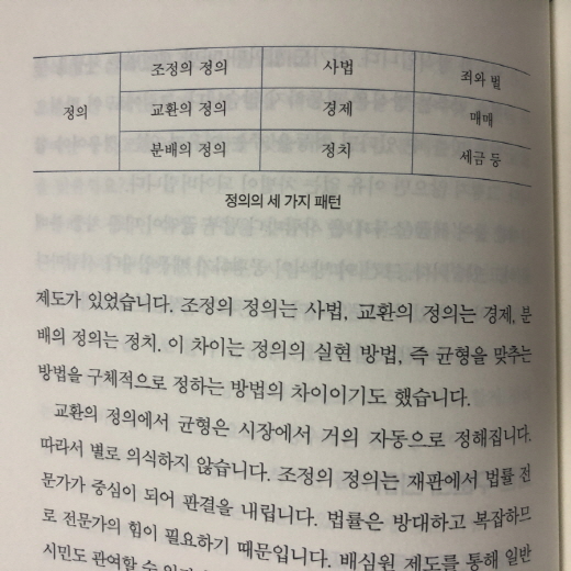 저자는 이어 정의는 하나의 본질과 세 개의 패턴으로 나누어 진다고 주장한다. 본질은 균형이고, 패턴은 조정(사법), 교환(경제), 분배(정치)가 그것인데 조정은 조와 벌의 균형을 의미하고 교환은 경제적인 그러니까 서로 주고 받는 등가의 법칙이며 분배는 공평하게 나누는 것의 균형이라고 말한다. 그리고 이것은 사회 구조 안에서 이루어지는 것이라고 정리한다.