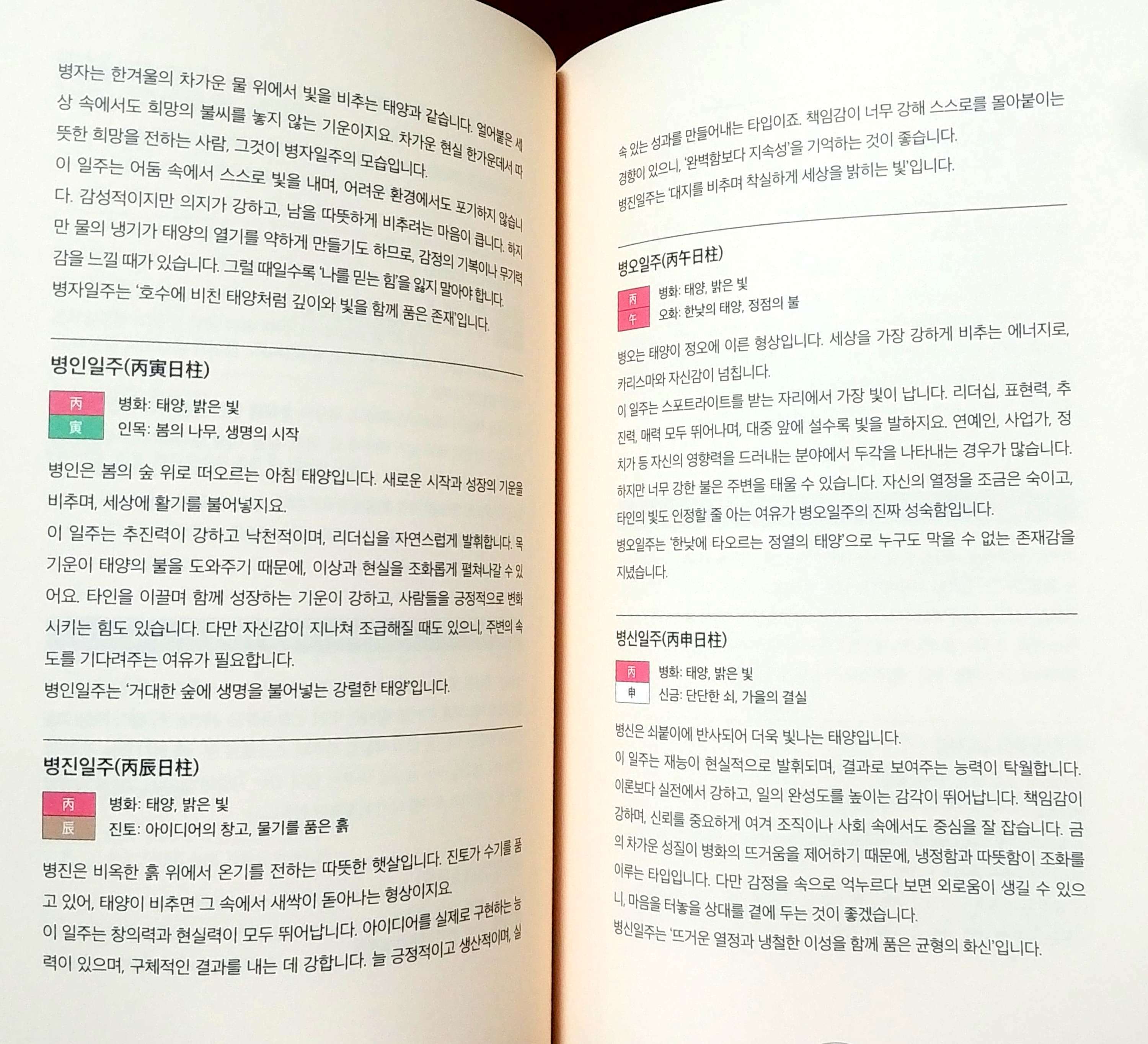 [부를 끌어당기는 내 사주 사용법] 책의 구성은 명확하다. 초반에는 사주와 오행, 일간 같은 기본 개념을 비유로 풀어준다. 나무, 불, 흙, 금속, 물 (오행) 을 자연의 흐름으로 설명하고, 상생과 상극을 관계와 환경에 빗대어 설명한다. 중반부로 가면 초년운, 중년운, 말년운처럼 인생의 흐름을 시간 단위로 나누어 해석하는 방법이 나온다. 후반부에서는 재물운, 직업, 인간관계, 투자와 선택의 시기처럼 현실적인 주제를 다룬다. 개인적으로는 나의 사주를 알았을 때 무엇을 조심하고, 무엇을 적극적으로 활용해야 하는 지를 설명하는데, 초반부의 대략적이고 당연한 설명 보다는 후반부로 갈 수록 더 중요도가 높은 내용이라 그 점은 아쉬움과 동시에 알찬 느낌이 든다. (책의 중반부에 60가지 일주로 나를 설명한 부분: 갑자일주부터 갑술일주까지)는 나의 대략적인 운을 확인할 수 있어서 특히 더 좋았다.