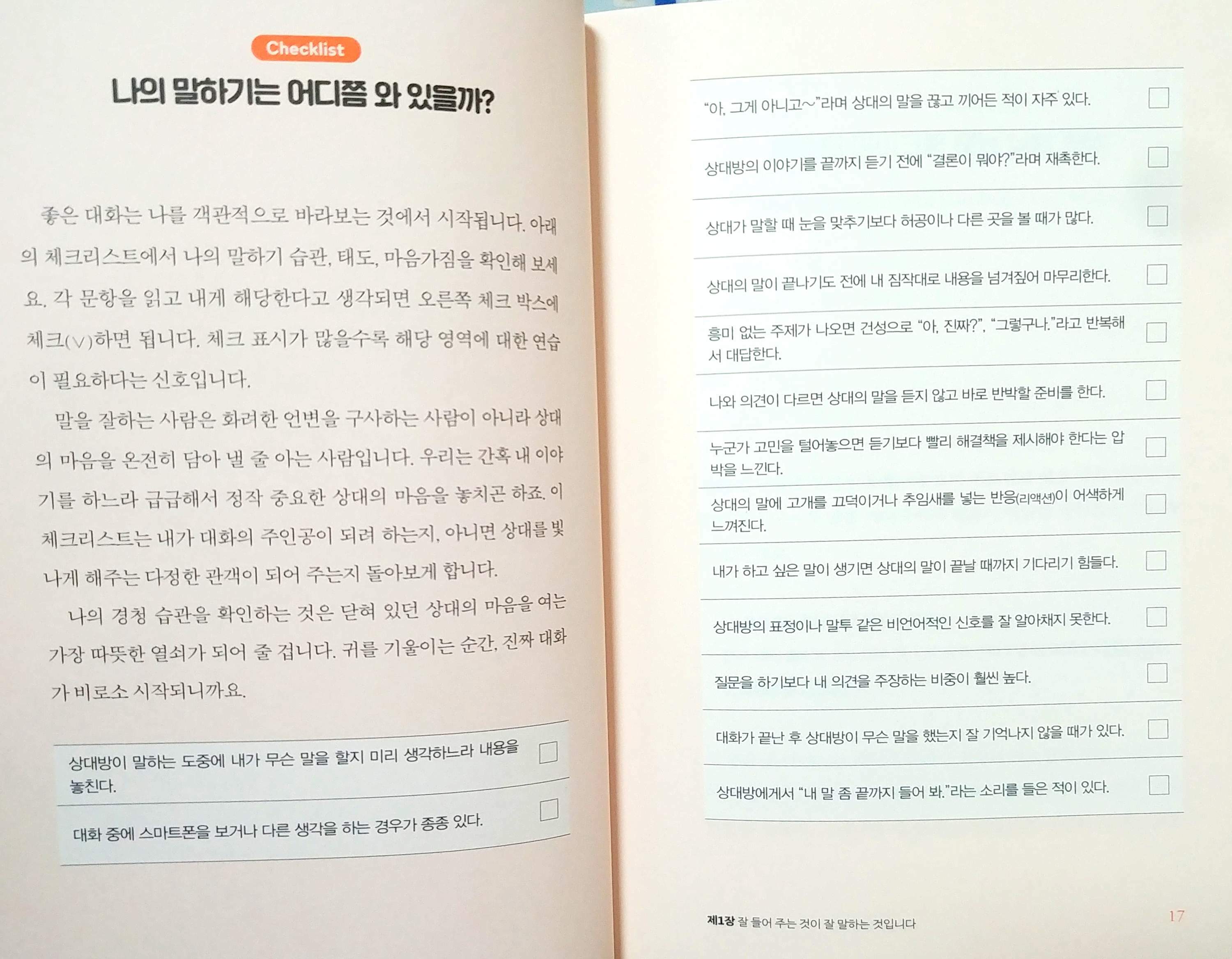 처음 제목을 봤을 때, 솔직히 다른 책과 크게 다를 것 없을거라 생각했다. 말하기 수업이라니, 어른이라면 심리적으로 어느정도 할말과 안할말쯤은 구별하게 마련이다. 그런데 차례를 보면 반드시 누군가가 생각이 난다. 말을 자르는 사람, 난 이미 알고 있던 부분이라며 자신을 치켜세우는 사람, 공격적인 말투, 사람의 계급을 나눠 대우하는 사람들. 등등 차례만 봐도 궁금한 심리가 너무 많았다.