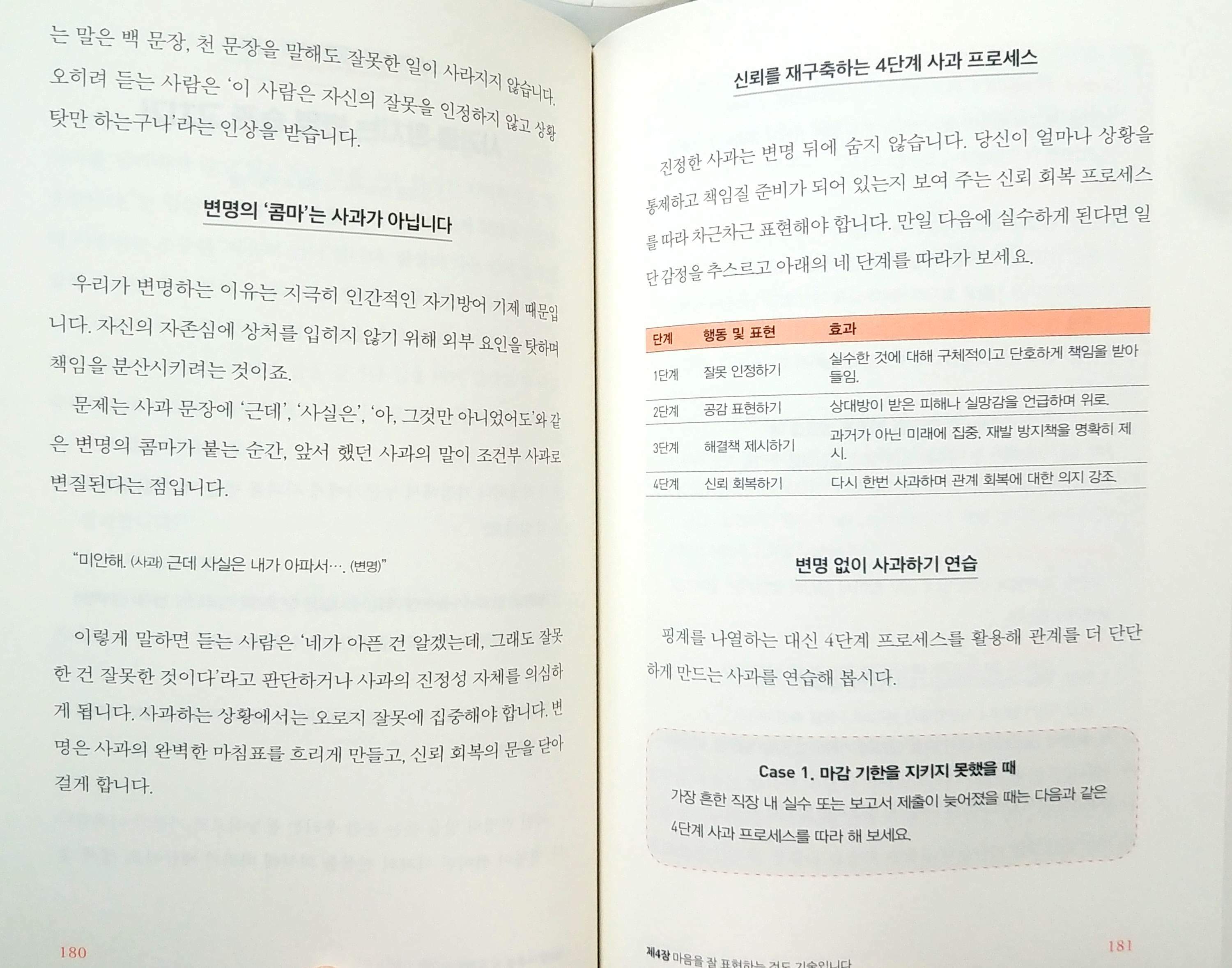 많은 심리서적들이 "이런 심리가 있습니다"까지는 설명해주는데, "그래서 내가 뭘 하면 되는데?"라는 질문에는 시원한 답을 하지 않는다. 전부는 아니겠지만. 거의 대부분이 그렇다. 그런데 이 책은 설명이 나오면 반드시 사례가 따라오고, 사례 다음에는 바로 쓸 수 있는 문장이 나온다. 읽는 내내 이미 답을 손에 쥐여주는 느낌이라 충분히 참고할 수 있는 책이었다.