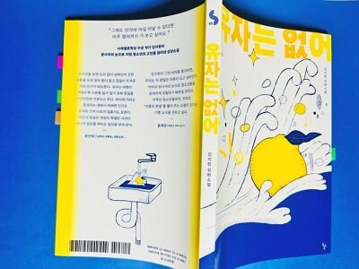 거제 바다의 거센 파도가 노오란 유자를 덮치는 찰나를 담은 앞표지가 인상적으로 다가왔다. 어찌 보면 파도가 집어삼킬 듯 보이기도 하고 또 달리 보면 유자를 멀리 밀어주는 듯 보이기도 했다. 왠지 모르지만 노오란 유자는 꿋꿋이 살아남을 것 같은 강인한 생명력을 뽐내고 있다. 책 제목과 연관 지어 보면서 유자의 운명을 가늠하다 뒤표지를 보았다. 앞표지의 진실을 알려주는, 위트 넘치는 그림에 빵 터졌다. 어쩌면 우리가 감각하고 인지하는 정보는 이런 착각을 내포하고 있는지도 모르겠다. 이제 진짜 이야기를 만나러 가볼 시간이다.