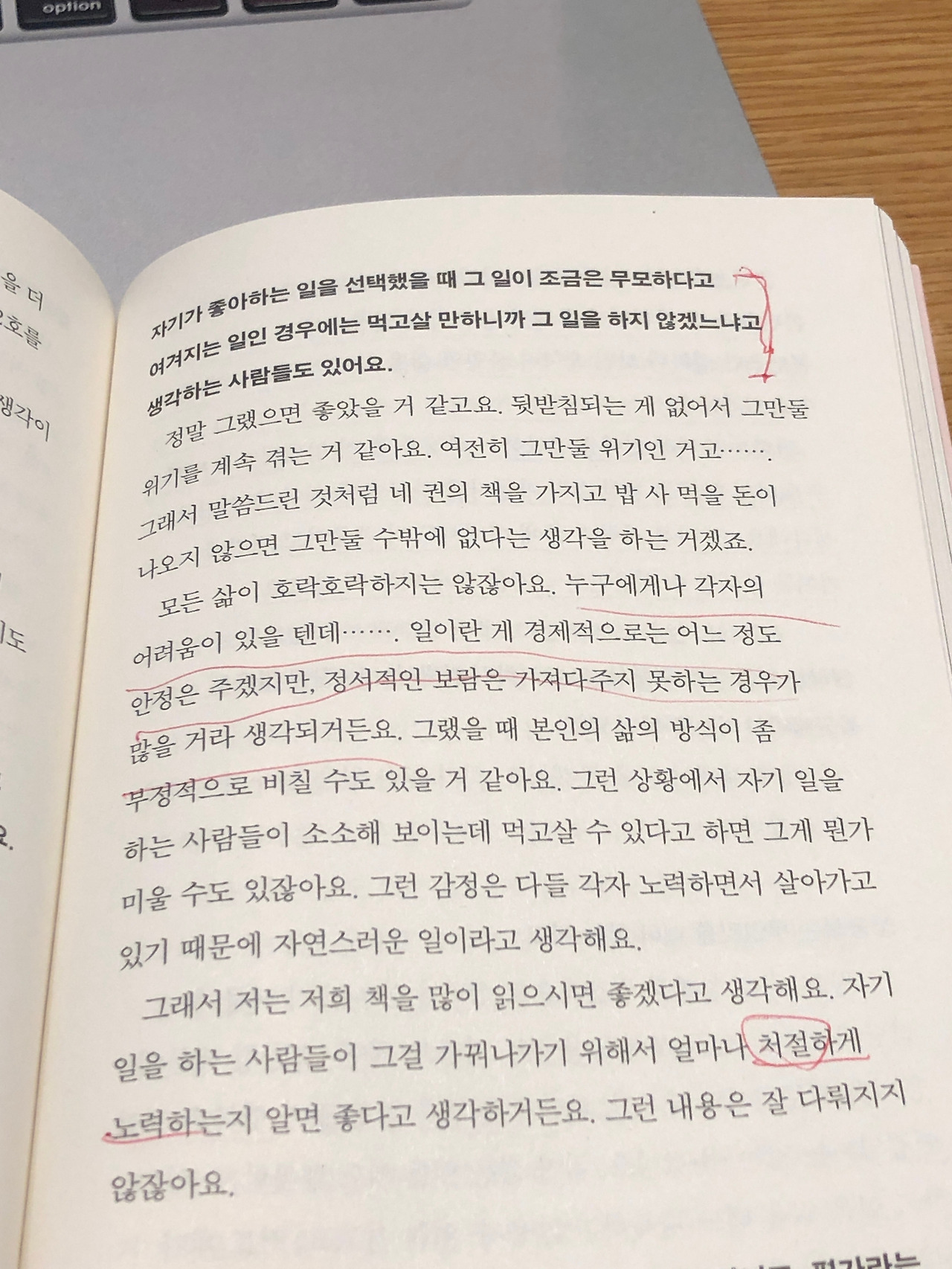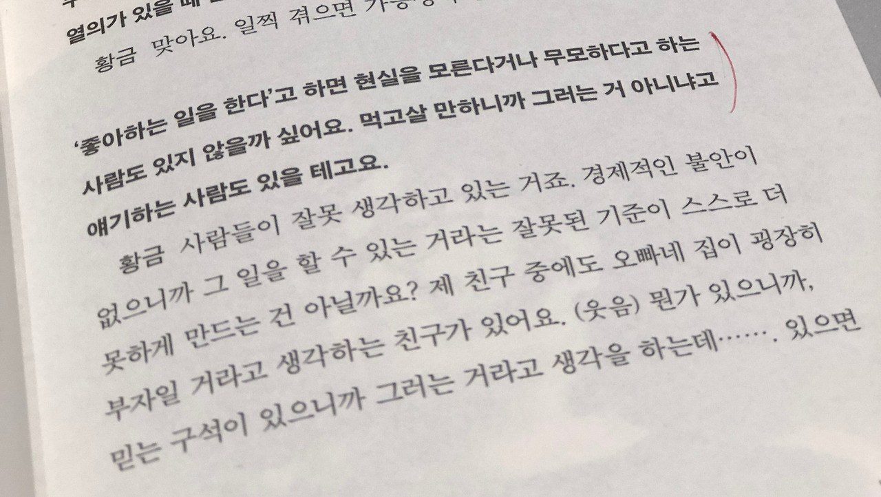 세상이 원하는 직업이나 보편적인 직업 선택의 기준으로만 삶을 바라보는 대다수들에겐 이런 인터뷰이와 인터뷰어의 말이 나이브하게 들릴지도 모릅니다. 아마 대다수는 속으로