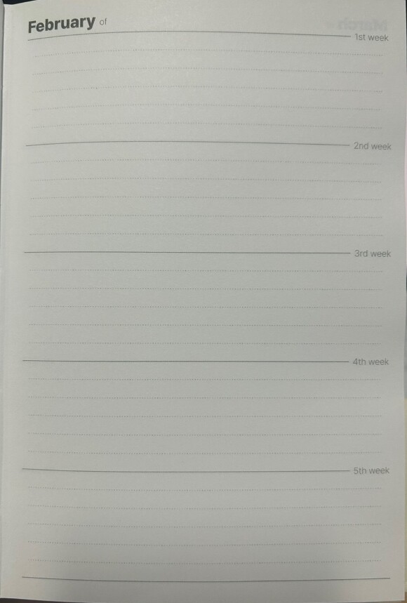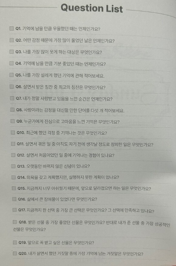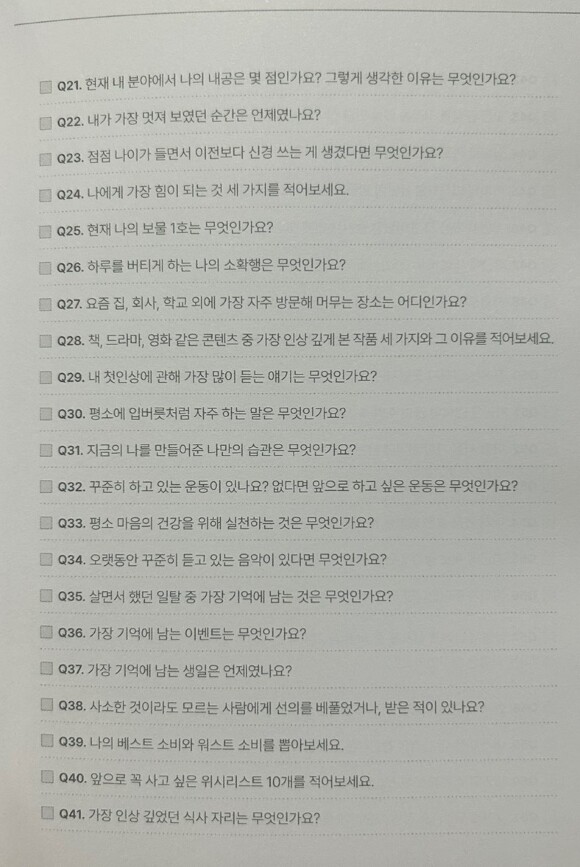이 다이어리의 구성은 먼저 사진과 같이 78개의 질문이 있는 리스트가 존재한다. 5년 다이어리처럼 질문에 대하여 답을 생각할 수 있는 기회를 준 것 같다. 그다음으로는 일기를 적을 수 있는 양식이 존재한다. 한 장에 5주의 일기를 쓸 수 있게 하였고, 이 분량이 총 30년 치가 수록되어 있다. 총 360장으로 구성되어 있어서 30년 치가 맞다. 5년 다이어리도 채우기 힘들었는데 30년이라는 세월의 무게에 부담이 되긴 하지만, 두려움으로 시작조차 안 한다면 어리석기 때문에 한 줄이라도 계속해서 쓰고 있다. 한 가지 아쉬운 점은 이 다이어리를 만들게 된 이유와 작가님의 생각을 포함하고 있는 머리말이 있었더라면 더 좋았을 것이다.