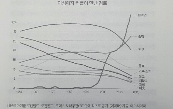 미국에서 커플이 만난 경로를 데이터화 해서 나타낸 그래프다. 온라인이 가장 많았는데 이 온라인은 데이트 어플을