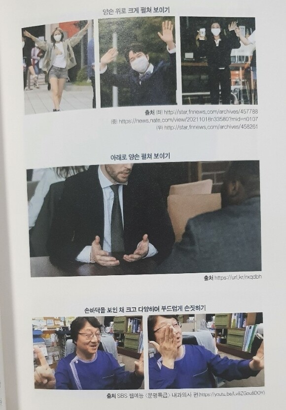 한 동작을 다 통일하여 설명했다. 예를 들어 손바닥을 보이는 자세는 자신감이 넘치는