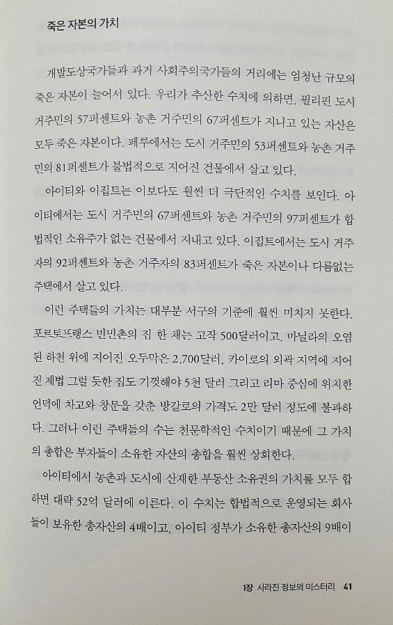 죽은 자본이란 합법적으로 인정받지 못해 금융서비스를 이용하지 못하는 자본을 의미한다.