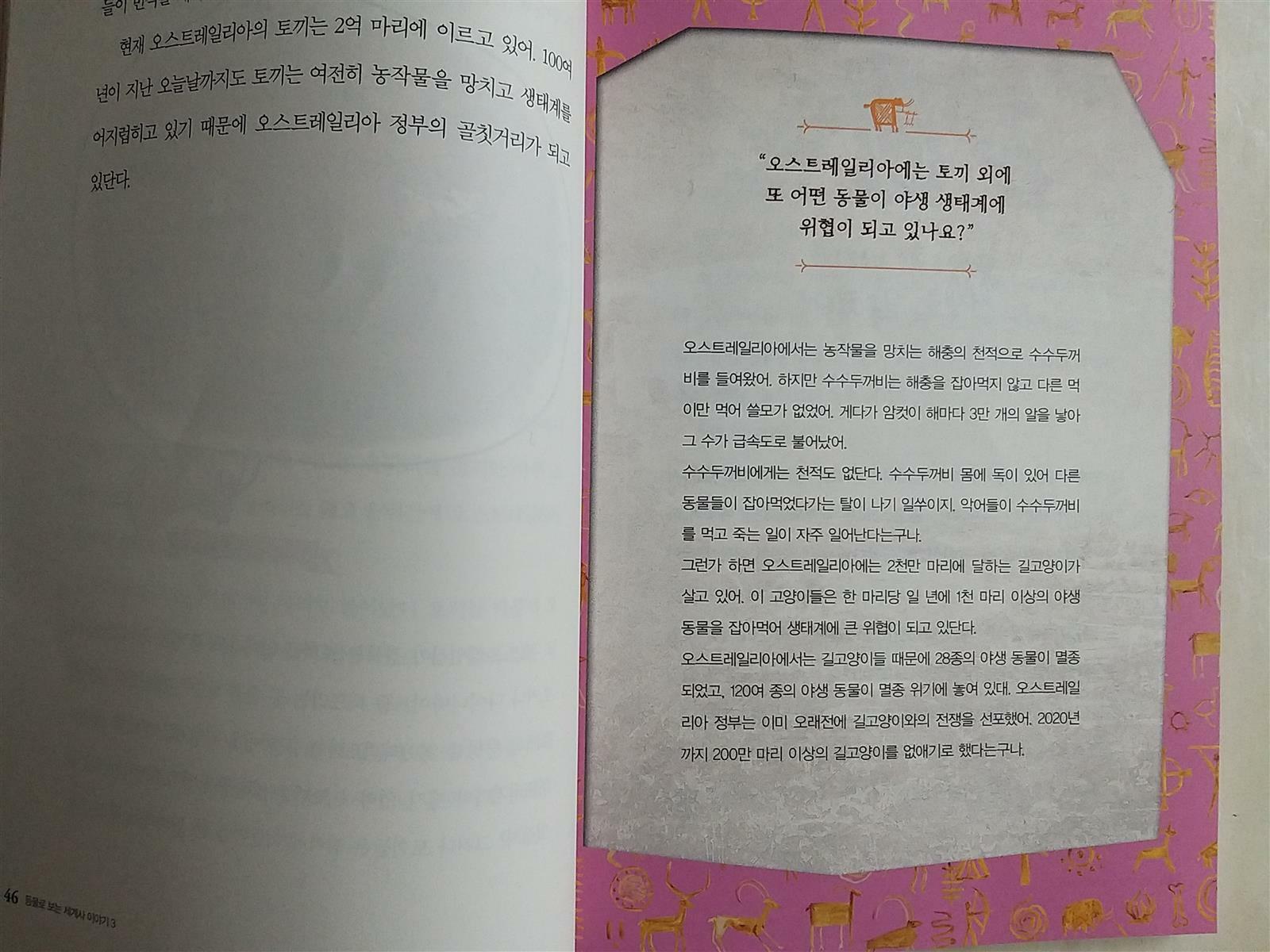 서부 개척 시대 이야기와 일본 개국에 얽힌 이야기도 흥미로웠지만 토끼 사냥을 위해 영국에서 들여온 토끼 24마리가 천적이 없어 빠른 속도로 증가한 토끼의 이야기는 다소 충격적이었네요. 정부까지 앞장서 토끼 퇴치에 나섰지만 지금도 오스트레일리아의 골칫거리라고 하니 하루빨리 대책이 마련되서 토끼에게서 해방될 수 있기를 바래봅니다. 아울러 오스트레일리아의 수수두꺼비와 길고양이 문제도 굉장히 심각하네요. 어찌보면 이런 문제들은 인간의 잘못이 제일 크지 않을까라는 생각이 드네요.