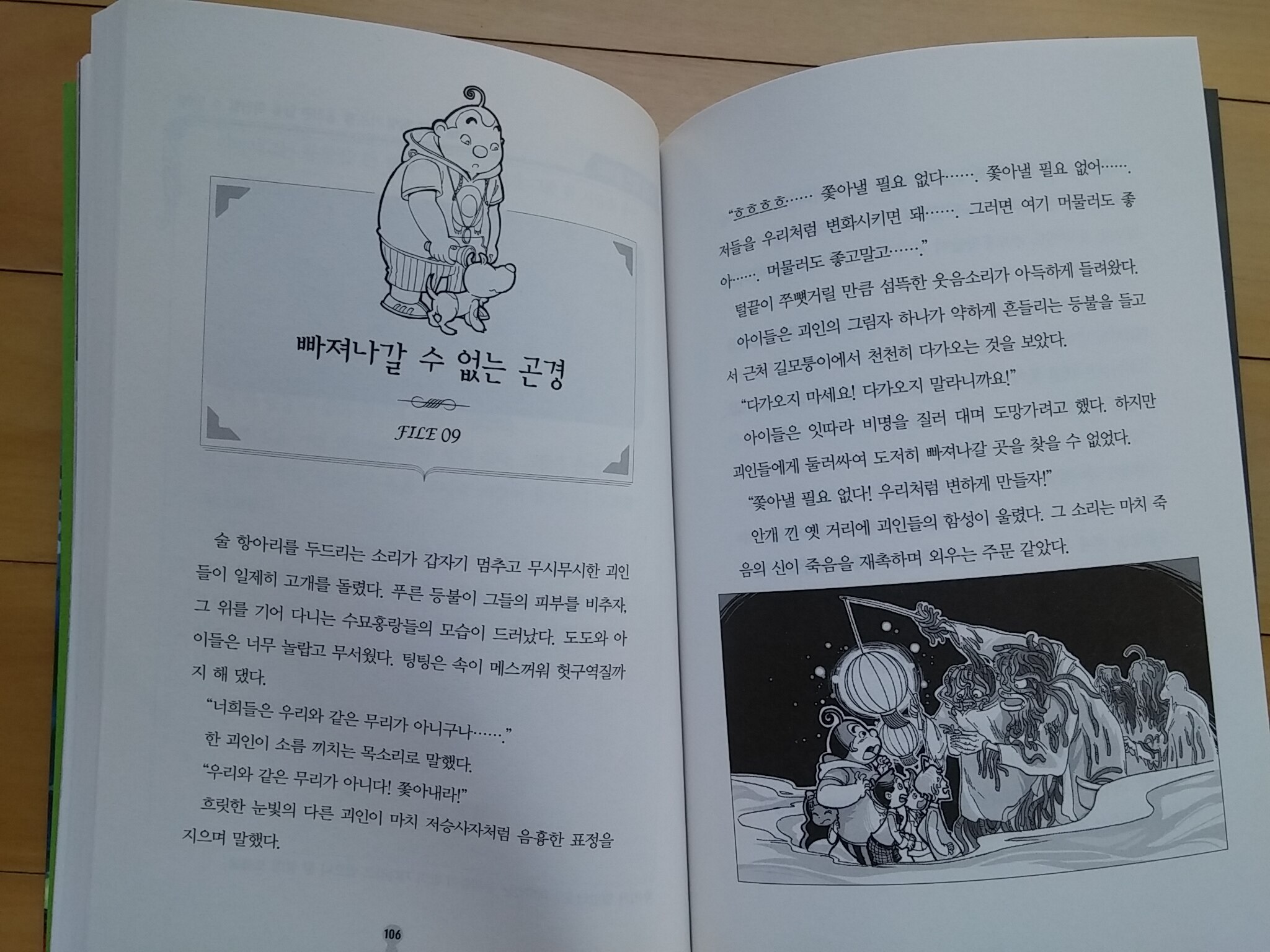 표지에 있던 붉은 실이 드디어 등장했어요. 도도의 침대에서 도도에게 위협을 가했지만 다행히 친구들의 도움으로 도도는 무사할 수 있었어요. 이 붉은 실은 형체가 잘 드러나지 않고 살아있는 것처럼 움직여서 더 궁금증을 불러일으키네요. 아직까지는 이것의 정체가 드러나지 않았지만 뭔가 이상한 사건의 중심에 연관이 되어 있을 것 같은 예감이 드네요. 이것들이 모여서 거대한 형체를 만들어서 거스 부모님과 아이들을 공격해서 아이들은 차고에서 차를 끌고 무작정 도망치게 되요.