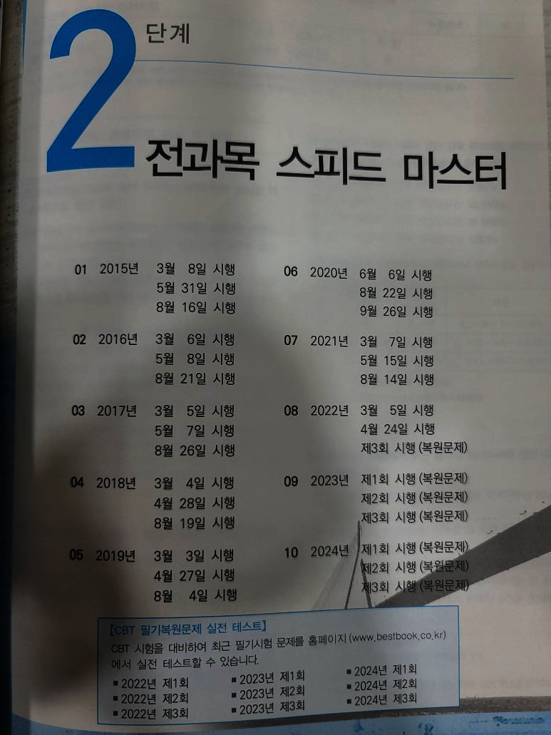 2단계 전과목 스피드 마스터에는 과년도 기출문제가 2015~2024년까지 총 10년치나 수록되어 있습니다. 10개년의 기출문제들이 자세한 해설과 함께 수록되어 있어서 공부를 하는데 최고입니다.