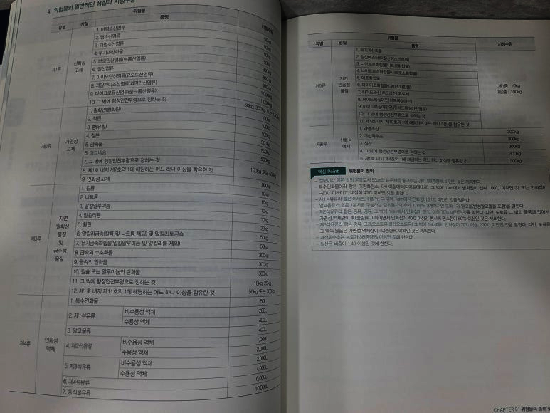 이론부분을 펼쳐보니, 자세한 설명과 그림들이 수록되어 있습니다. 그림도 아주 자세하게 설명이 되어 있습니다. 위험물의 성질과 지정수량에 대한 자세한 표도 보입니다.
