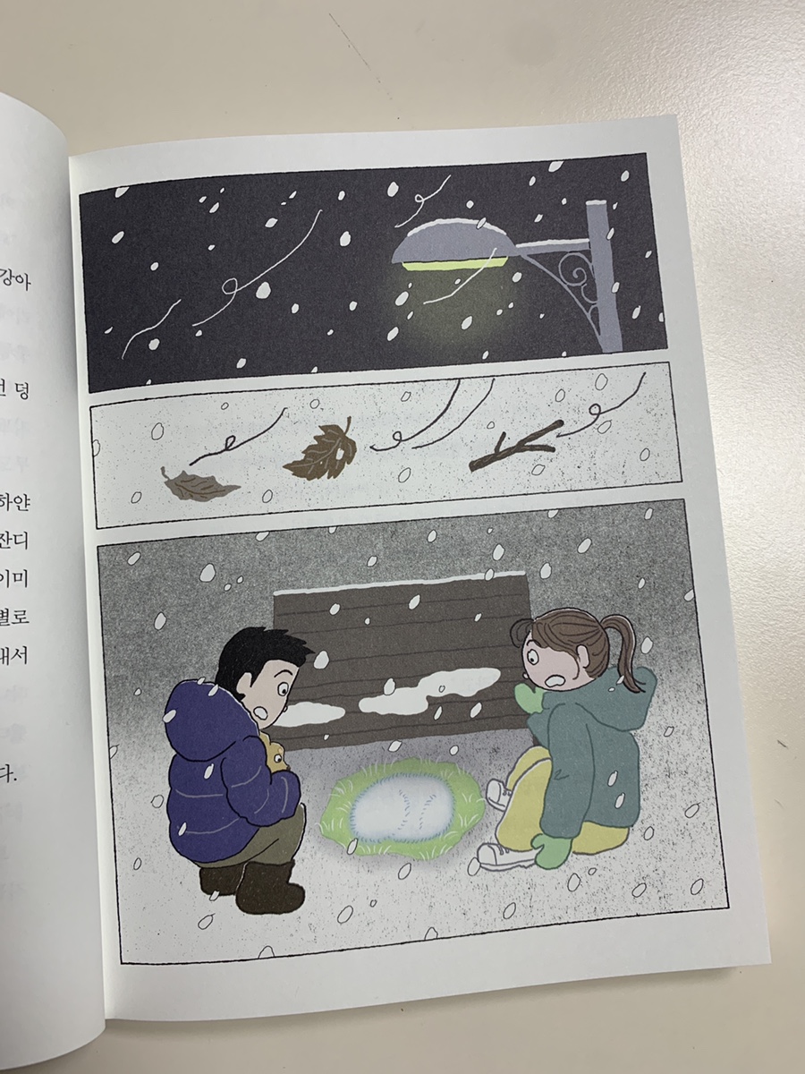 눈이오고 몹시 추운 날 아이 둘이 인적인 드문 공원을 걷는 이야기로 시작되어 사건이 일어날 것 같았는데 꽁꽁 얼어있는 강아지라서 깜짝 놀랐다. 죽은 강아지의 배를 만지기도 하고, 아직 살아있다고 느껴 긴박하게 동물병원으로 향하는 두 아이들을 볼 때 조마조마한 마음이 들었다.
