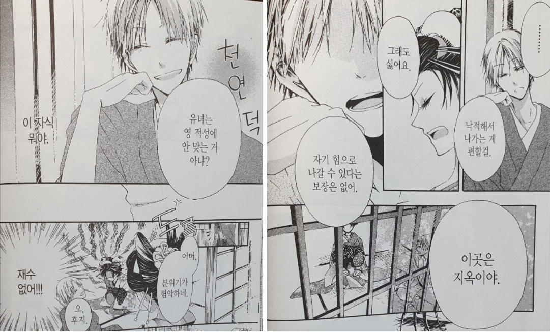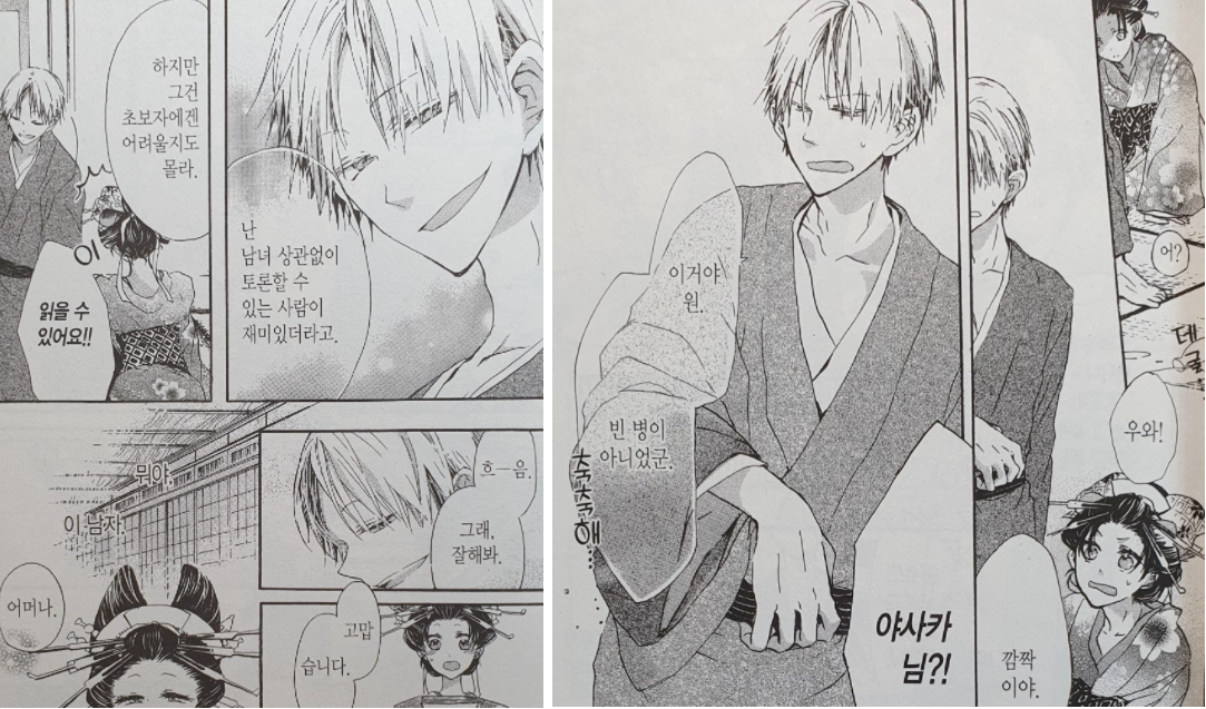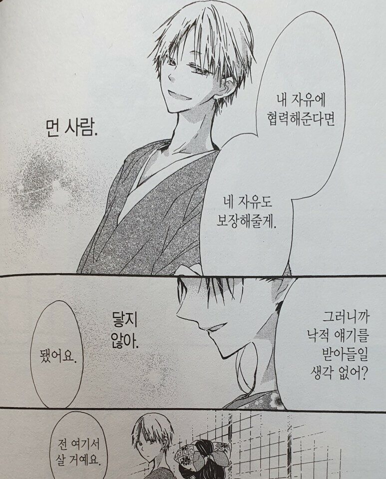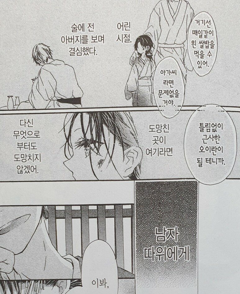 내가 그렇게 즐기지 않는 시대물이자 작중 배경이 유곽이기도 해서 첫인상은 그렇게 좋지 않았는데, 생각보다 재밌게 읽었다. 초반에 유곽과 관련된 용어 설명이 많아서 정신 사나운 것, 등장인물들의 생김새가 조금 헷갈리는 것(개인적인 의견)은 있었지만 내용은 오버스럽지 않고 적당히 달달해서 재밌었다. 내용이 너무 짧은 것은 아쉽다.