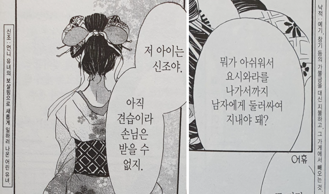 어차피 시집이라고 해봤자 유녀는 유녀일 뿐이고, 여성의 지위가 매우 낮았던 메이지 시대이기에 오히려 자유를 잃어버리는 것이기도 하다. 아야메는 이곳에서 배울 만큼 다 배우고 자신의 힘으로 문을 박차고 나갈 것이라고 한다.