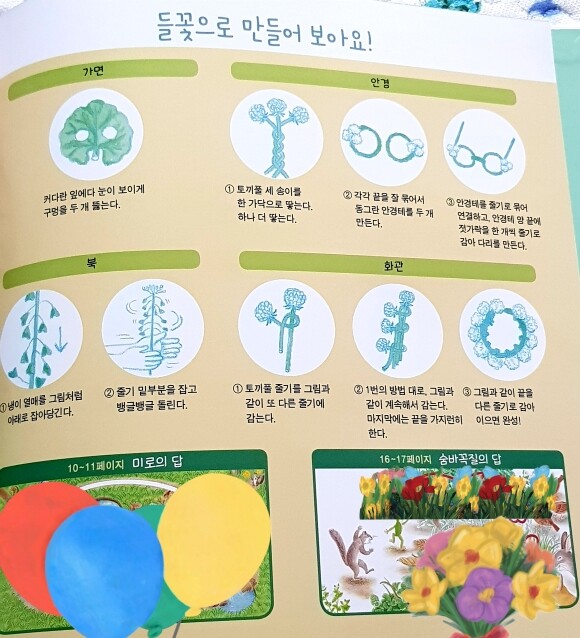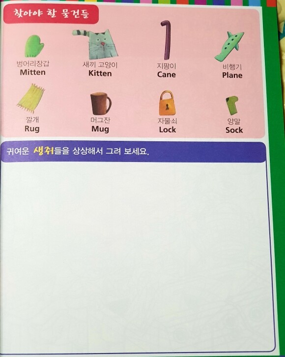 숨은그림찾기, 색칠하기, 별표 색칠하기, 숫자 순서대로 잇기, 한글 쓰기, 영어 쓰기, 선으로 연결하여 단어