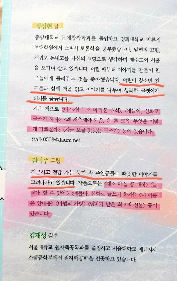 지은 책으로는 『행복한 초대』, 『장수 경쟁!』, 《갈매기 유치원》시리즈 등이 있다.