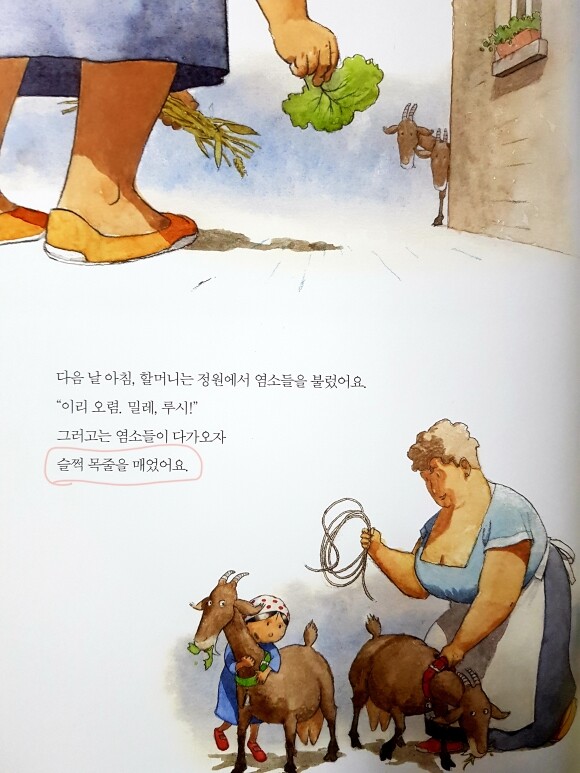 할머니는 염소들이 기특해서 줄을 풀어주었어요