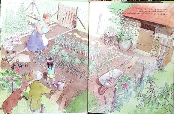 책표지 탐색을 하고 책장을 넘기니 마당에 농작물들이 자라고있고 문밖에있는 염소를 가리키는 여자아이와 문밖에서 아주머니의 눈치를 살피는듯한