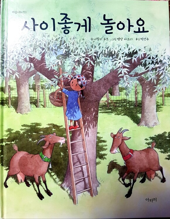 사이좋게 놀아요라는 책의 앞표지 여자소녀와 염소두마리가 나무옆에있는 모습이다.