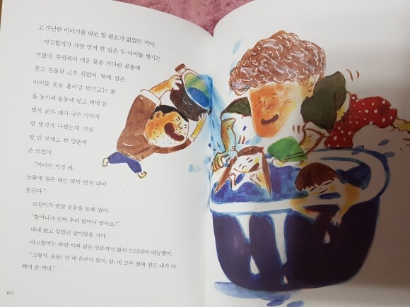 책의 앞표지를 탐색해보니 겁먹은 아들과 할머니,커다란 가마솥 안에서