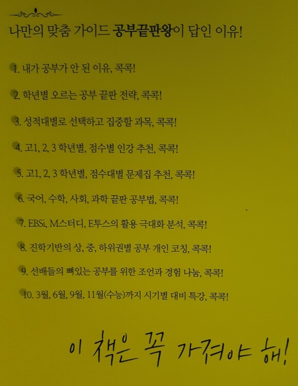 그래서 고등학생들에게 이 「학생부 끝판왕」 무조건 필요합니다. 단순히 희망 대학을 가기 위한 비법만을 제시하는 것이 아닌, 미래지향적 관점에서 3년간의 학교생활 커리큘럼을 거미줄처럼 얽어 하나의 단단한 무기를 만드는 방법을 안내하고자 합니다.