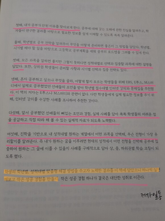특히 대입을 위한 가이드 라인을 제공받는다는 점은 입시에 자신감을 주며, 나만의 진학 로드맵을 작성하는 데 구체적인 나침반 역할을 합니다. 처음 떠나는 해외 여행지에 대한 사전 정보를 얻기 위해 여행 가이드를 사서 읽어보는 것과 같은 맥락입니다. 사례별 상황과 개별 역량에 차이가 있을 수 있으나, 다수의 사례 속에서 공통분모를 찾고, 이를 디딤돌로 삼아 본인의 상황과 맞춰본다면 성공적인 대입을 위한 출발에서 이미 한 걸음 앞서있다고 생각해도 좋습니다. 이미 대학에 합격한 것과 마찬가지라는 설레발일 수도 있으나, 이 책을 집필한 필자들의 자신감만큼은 그러합니다.