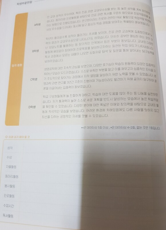 이 책은 어떤 활돌을 하면 좋을지에 대한 방향을 제시하는 것이지 '이런 학교생활기록부가 옳다'라는 답은 아닙니다.