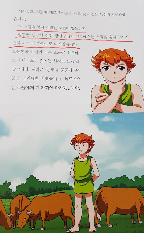 소 주인이 누구인지 생각도 안하고, 엉뚱한 생각에 잠긴 헤르메스는 소 떼들을 훔치기로 작정했어요