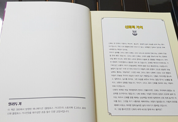 이 책은 SBS에서 방영된 애니메이션 <올림포스 가디언>의 스토리북<그리스 로마신화 올림프스 가디언>을 재구성한 초등 필수 인문 교양서임을 알려는 글이 적혀있다