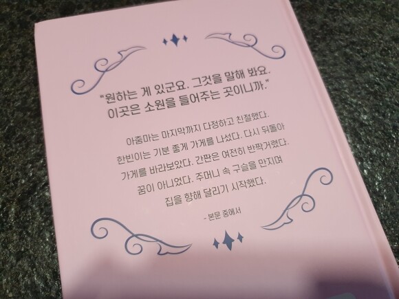 "원하는 게 있군요. 그것을 말해봐요. 이곳은 소원을 들어주는 곳이니까." 라는 글귀에 어떤 내용의 책일지 너무너무 궁금해 하더라구요 ㅎㅎㅎ