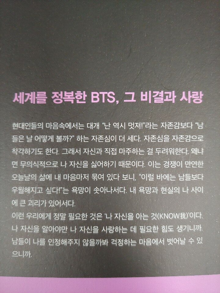 1부에서는 BTS의 노래 가사에 담긴 철학적, 심리적 고찰에 대해 쓰여있다. 1부를 읽으며, 유튜브를 통해 처음으로 BTS의 노래를 들어봤다. 빠른 노래는 사실 가사가 잘 들리지 않는터라 가사가 담긴 영상을 찾았다. 첫 장부터 새롭다. 경쟁이 만연한 오늘날의 삶에 내 마음마저 묶여 있다 보니 "이럴 바에는 남들보다 우월해지고 싶다"는 욕망 속에 괴리(4)를 이야기한다.