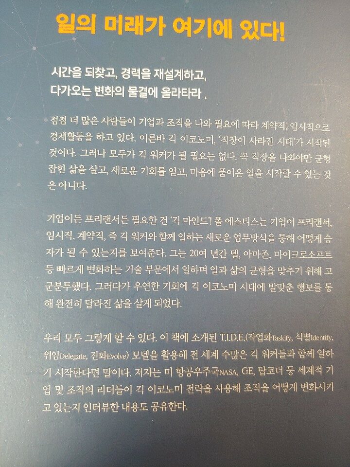 어쨌든 긱 이코노미를 통해서 우리는 변화는 경험하고 있다. 그 속에서 실험실과 같은 세상 속에 긱 마인드로 살아가야 한다. 때론 반대에 부딪힐 수도 있지만, 코끼리를 춤추게 한다는(264) 것이 전체 프로세스가 잘 돌아가게 만드는 길이다. 변화된 시대 속에서 우리의 일의 흐름은 조금씩 변해갈 것이다(나는 그렇게 믿는다. 갑작스럽게 변화가 생기진 않을 것이다). 한 사람이 모든 일을 다하는 시대는 지나가고 있는 듯 하다. 작업화, 식별, 위임, 진화 를 잊지 말자.